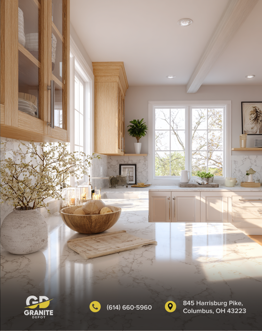 Granite Depot of Columbus ensures that clients select slabs that complement cabinetry, flooring, and appliances, creating a cohesive design without sacrificing performance.